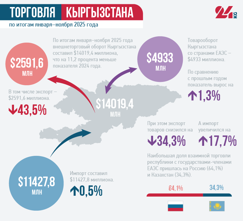 Объем внешней торговли Кыргызстана за 11 месяцев 2025 года составил $14 миллиардов 19,4 миллиона. По данным Национального статистического комитета, по сравнению с январем — ноябрем 2024 года показатель уменьшился на 11,2 процента. Темпы падения ускорились: по итогам 10 месяцев снижение составляло 9,6 процента.