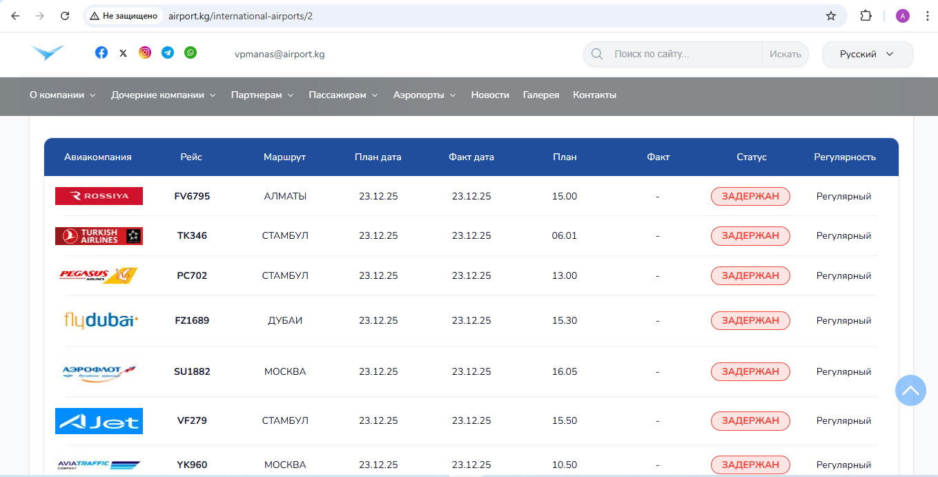 Уточняется, что в последние дни отмечаются проблемы в работе аэропорта «Манас» из-за плотного тумана и плохой видимости.Накануне отменили 11 авиарейсов, еще 4 задержали, часть смогла вылететь.