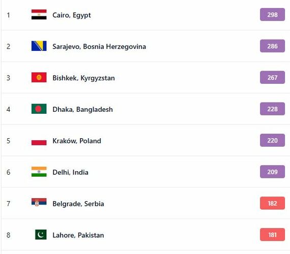 В рейтинге крупнейших городов мира по качеству воздуха World Air Quality на 20.40 Бишкек находится на первом месте.