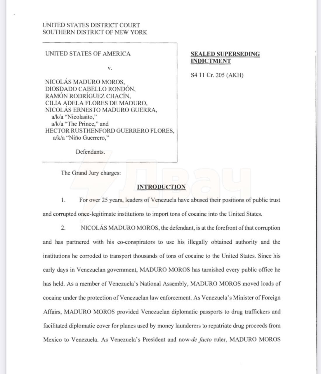 В документе, говорится, что «на протяжении более 25 лет лидеры Венесуэлы злоупотребляли своим общественным доверием и коррумпировали некогда законные институты, чтобы ввозить тонны кокаина в Соединенные Штаты».