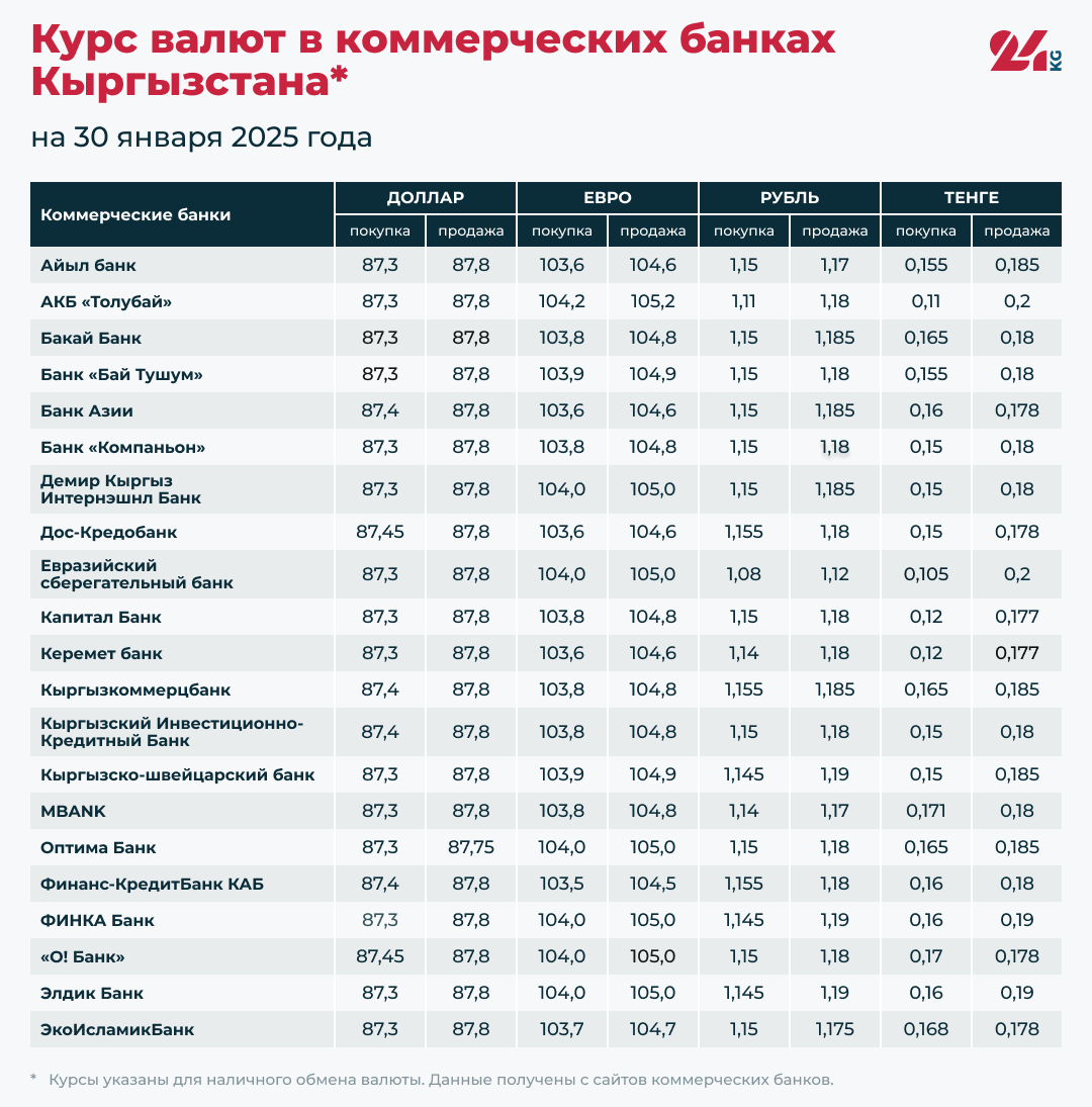 Курс валют в коммерческих банках Кыргызстана на 30 января