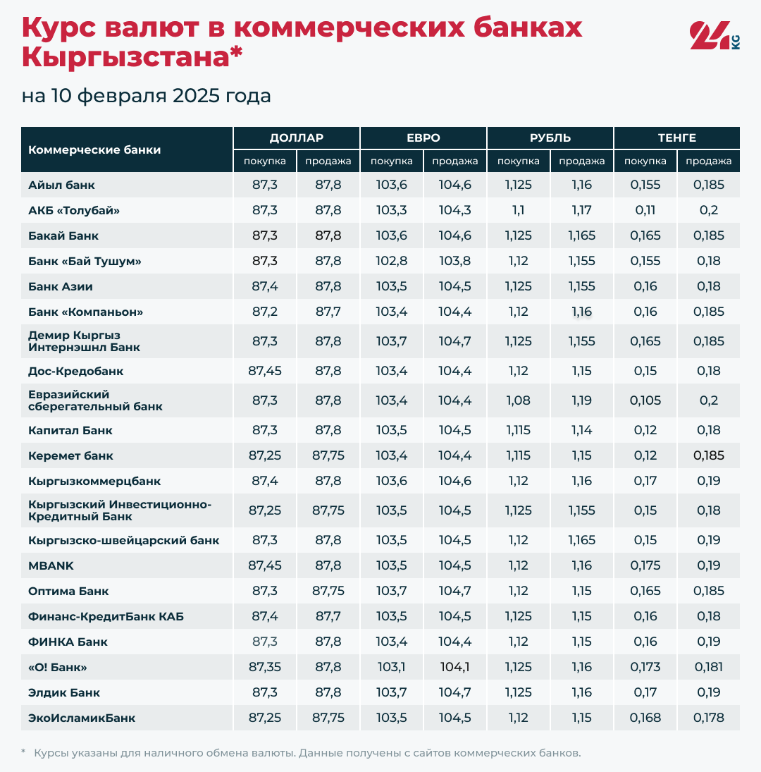 Курс валют в коммерческих банках Кыргызстана на 10 февраля