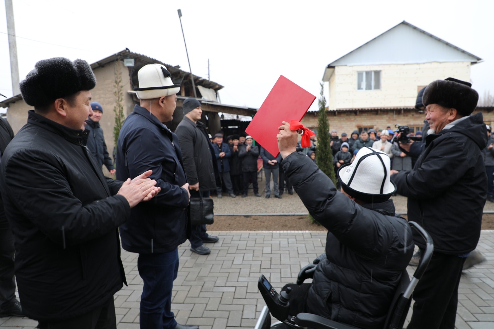 Глава ГКНБ Камчыбек Ташиев посетил дом жителя села Исмаил Сокулукского района Азата Жусуева и вручил ему ключи и правоустанавливающие документы на новое жилье.